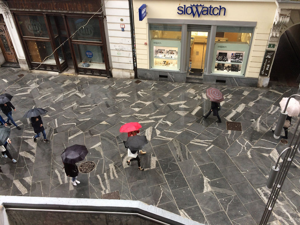 Mönchsberg conglomerate, dark grey to brownish colour, is all around you in Salzburg. But today, the new facades of shops and houses are made of material imported from the south of Vienna - the Lindabrunn conglomerate.