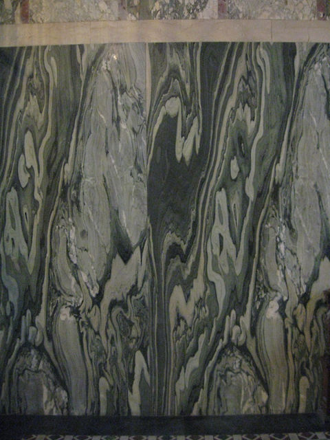 At the southern part of the island of Evia, Greece, large deposits of a unique type of marble are found –the Cipollino Verde. This was one of the most popular coloured marbles of the Roman Period and examples of its use have been found in almost every corner of the Empire as far north as Britain. Production probably started in the 2nd Century BCE and continued through the Imperial Period until the 7th Century AD. The Romans called it Marmor Karystium after the small town Karystos on the southern tip of the Island. The Cipollino Verde is an impure calcite marble containing bands rich in silicate minerals, displaying a lively pattern of folded and sheared layers. The marble can still be purchased through several ornamental stone suppliers.